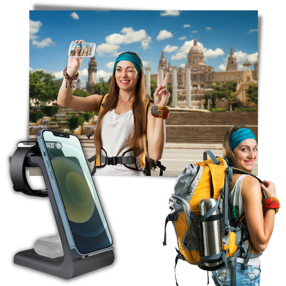 Tre dispositivi, un solo cavo, e una base che sembra uscita da un film futuristico. Niente più giungla di caricabatterie sul comodino. Il telefono si ricarica con classe, l’orologio con stile e gli auricolari… pure loro si sentono coccolati.