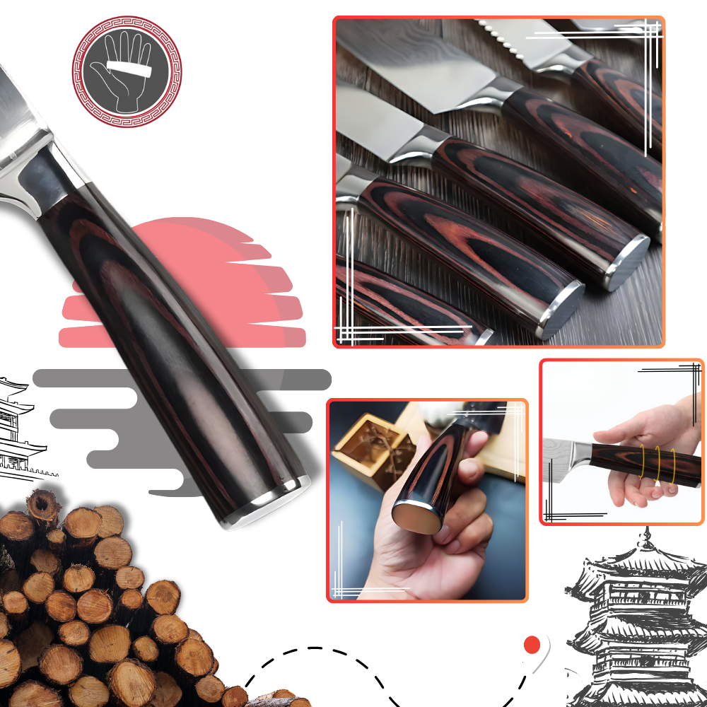 Crafted from pakka wood, the handle of each Forest Wood Japanese Knife are designed to withstand the rigors of both home and professional kitchens. Pakka wood is renowned for its exceptional resistance to moisture and its robustness, making it an ideal material for knife handles that demand durability and hygiene. The ergonomic design of the handle ensures it fits comfortably in the hand, providing a secure grip even in wet conditions, which enhances safety and control during use. This durability ensures that each knife not only stands the test of time but also maintains its aesthetic appeal, making these Japanese knives set a blend of practicality and luxury in kitchen tools.