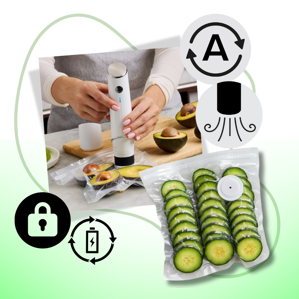 Equipped with smart auto shut-off functionality, Fresh Lock Vacuum Sealer takes the guesswork out of vacuum sealing. The device automatically stops once the sealing process is complete, ensuring optimal results every time. Paired with its powerful, rechargeable battery, this smart tech makes it convenient for regular use without frequent charging.