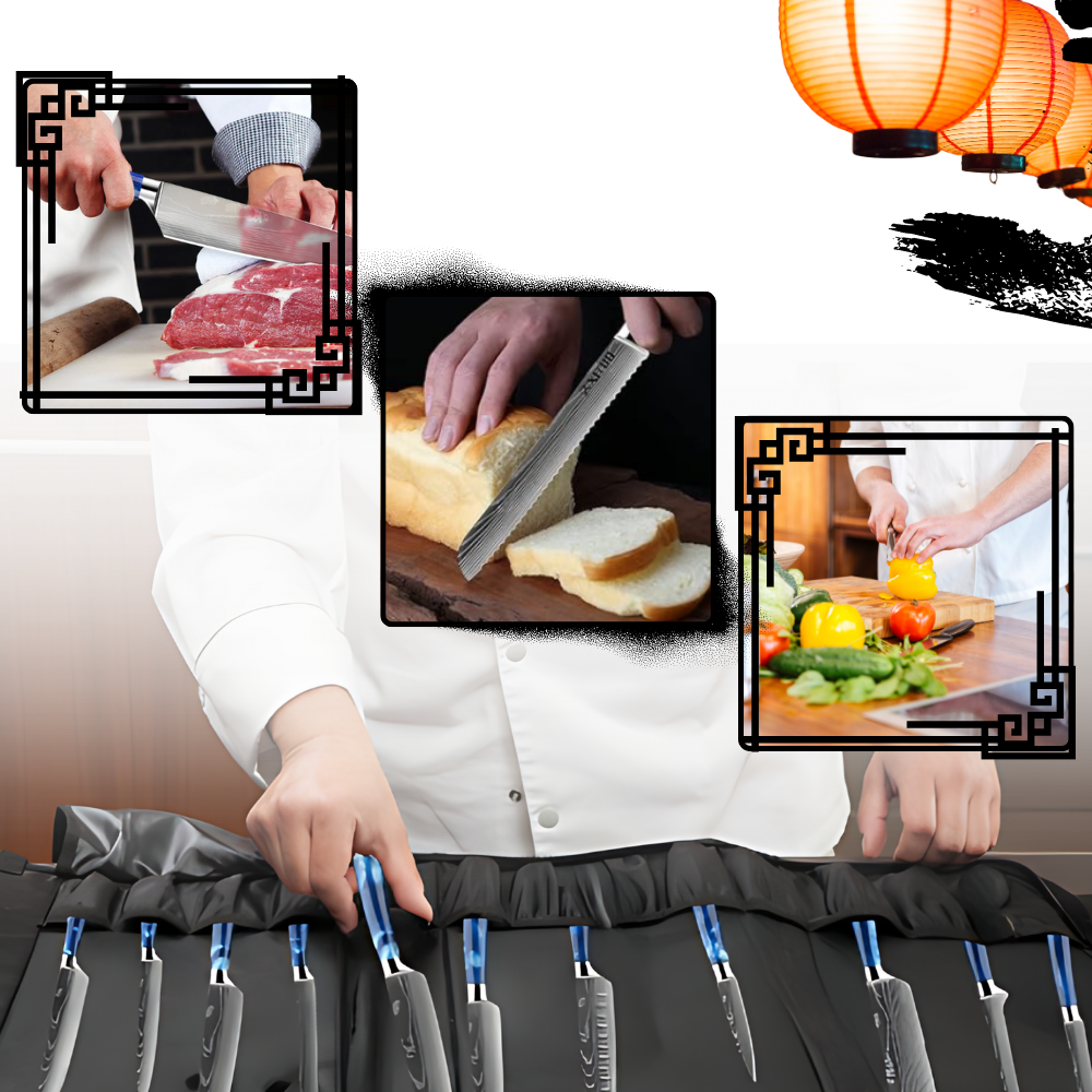 The Blue Ocean's collection boasts an exquisite range of 10 knives, epitomizing the brand's mastery over the art of Japanese knife crafting. Each knife in this set is meticulously engineered for a specific purpose, offering unparalleled versatility and precision. The collection includes the Gyutoh Chef Knife for handling large cuts of meat and vegetables, the Kiritsuke Knife for slicing and vegetable work, the Pankiri Bread Knife for perfect bread slicing, the Nakiri Cleaver Knife for precise vegetable chopping, the Honesuki Boning Knife for deboning meat, two Sujihiki Slicing Knives for delicate slicing tasks, two Santoku Knives known for their versatility in slicing, dicing, and mincing, and the Shotoh Paring Knife for intricate tasks. This comprehensive set not only fulfills every culinary requirement but also celebrates the rich heritage of Japanese blade-making.