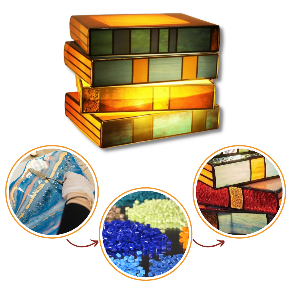 Timeless Stacked Books Lamp is a testament to its vibrant and artistic design, which significantly enhances its aesthetic appeal. The use of colorful resin in its construction not only adds durability and longevity to the lamp but also allows for a rich, vivid display of colors that mimic the beauty of traditional stained glass. This choice of material brings each book in the stack to life, with colors that pop and add a dynamic visual element to any room. The resin's ability to capture and reflect light enriches the lamp's overall presence, making it a focal point wherever it's placed. Whether it's casting a warm glow in a cozy reading nook or serving as an eye-catching centerpiece in a living room, the lamp's colorful resin construction ensures it's not just a source of light but a piece of art that celebrates creativity and style.